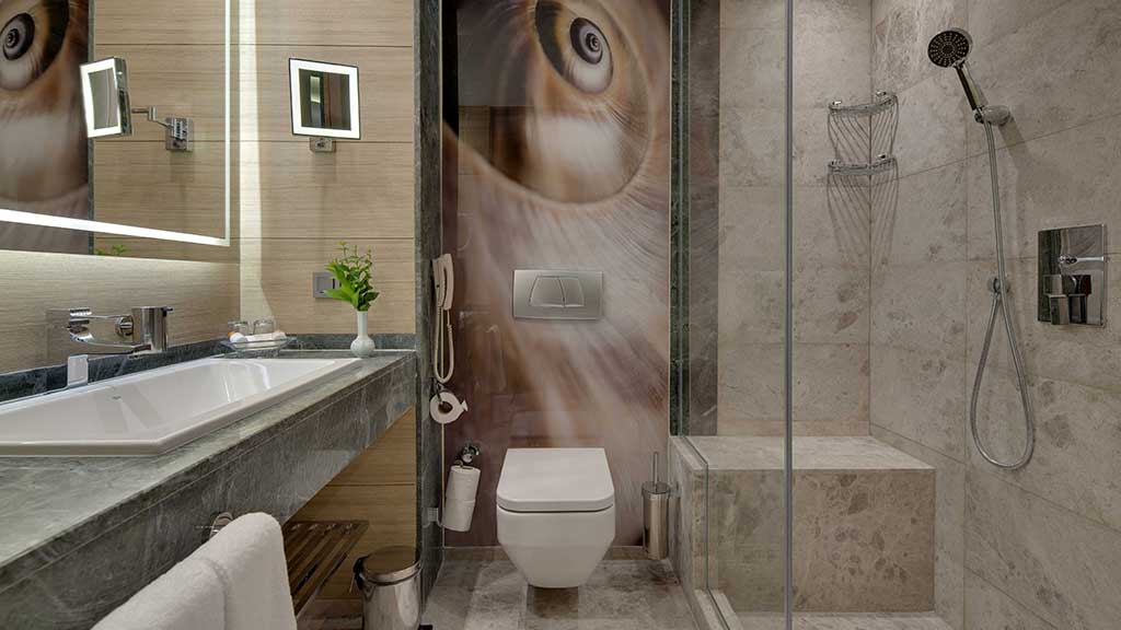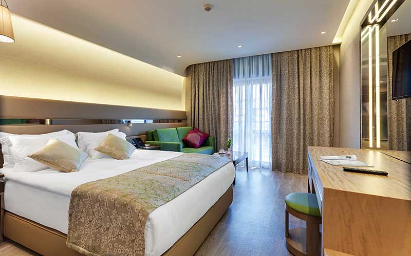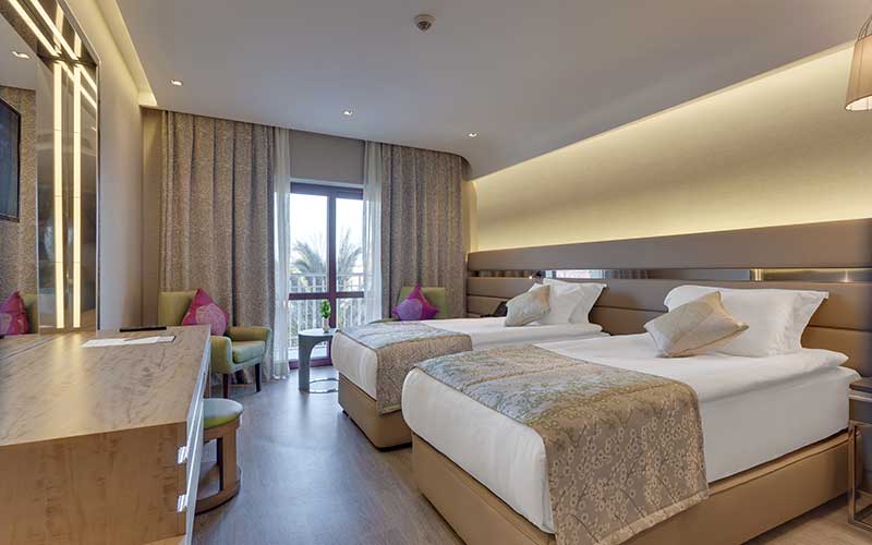 Fine dobbeltrom ( 28 m²) med varierende innredning. Alle rommene har balkong mot omgivelsene og aircondition. Tv. Minibar. Badekar/dusj og wc. Studio (ca. 47 m²) med oppholdsrom (to enkeltsenger) og soverom (en dobbeltseng, queen size) og Leilighet (ca. 62 m²) med oppholdsrom (sovesofa) og to soverom (en dobbeltseng, queen size resp og 2 enkeltsenger). I oppholdsrommet er det tv og bord med stoler. Ellers er det utstyrt som vanlige dobbeltrom. |